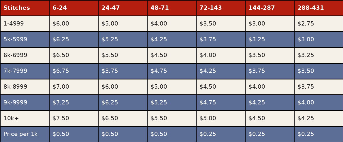 $2.50 plus the stitch count price in the 1-5 quantity column, includes name setup.